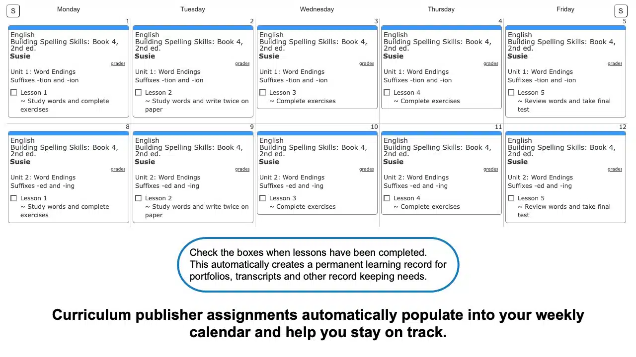 - A full school year of scheduled assignments covering all the assignments for your Building Spelling Skills curriculum.