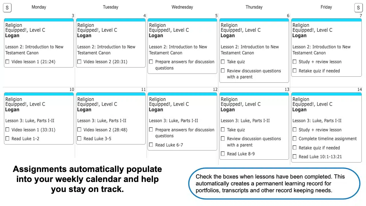 - Detailed weekly assignments for your Journey Homeschool- Bible curriculum in a convenient lesson plan
