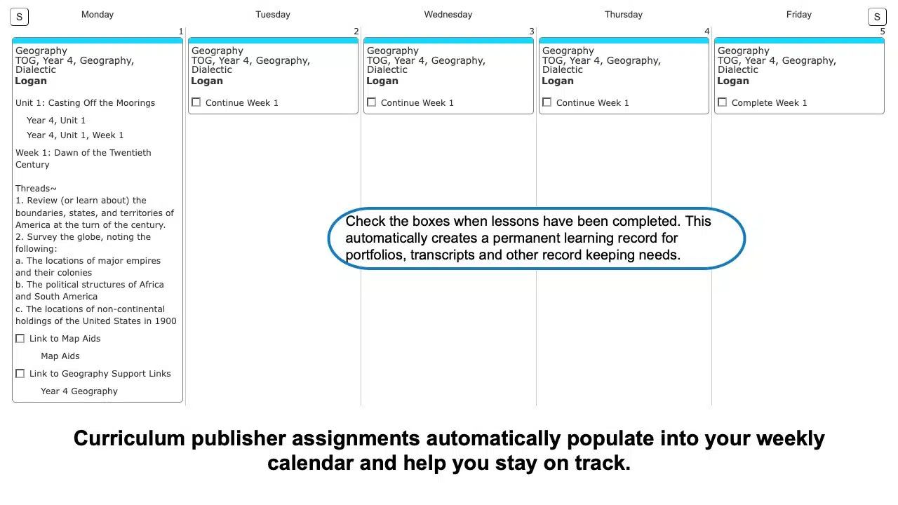 - 1 school year lesson plan, covering all the assignments for your Tapestry of Grace Geography Spool curriculum.